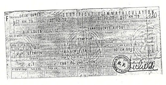 Op de Carte Grise is te zien dat de auto op 27 februari '70 tenaamgesteld is als VN Vehicule Neuf. Op de voorruit is nog een Tax-sticker te vinden van het seizoen '72/'73. Waarschijnlijk heeft hij zijn 87.000km dan ook in die periode gereden. De kale koetsen gingen van Heuliez naar de Citroën-fabriek in Rennes, waar ook de Ami werd gebouwd. Daar werden de M35's gespoten en afgebouwd. Deze auto is oorspronkelijk ook grijs geweest en op enig moment blauw gespoten, de lievelingskleur van M. Heuliez.